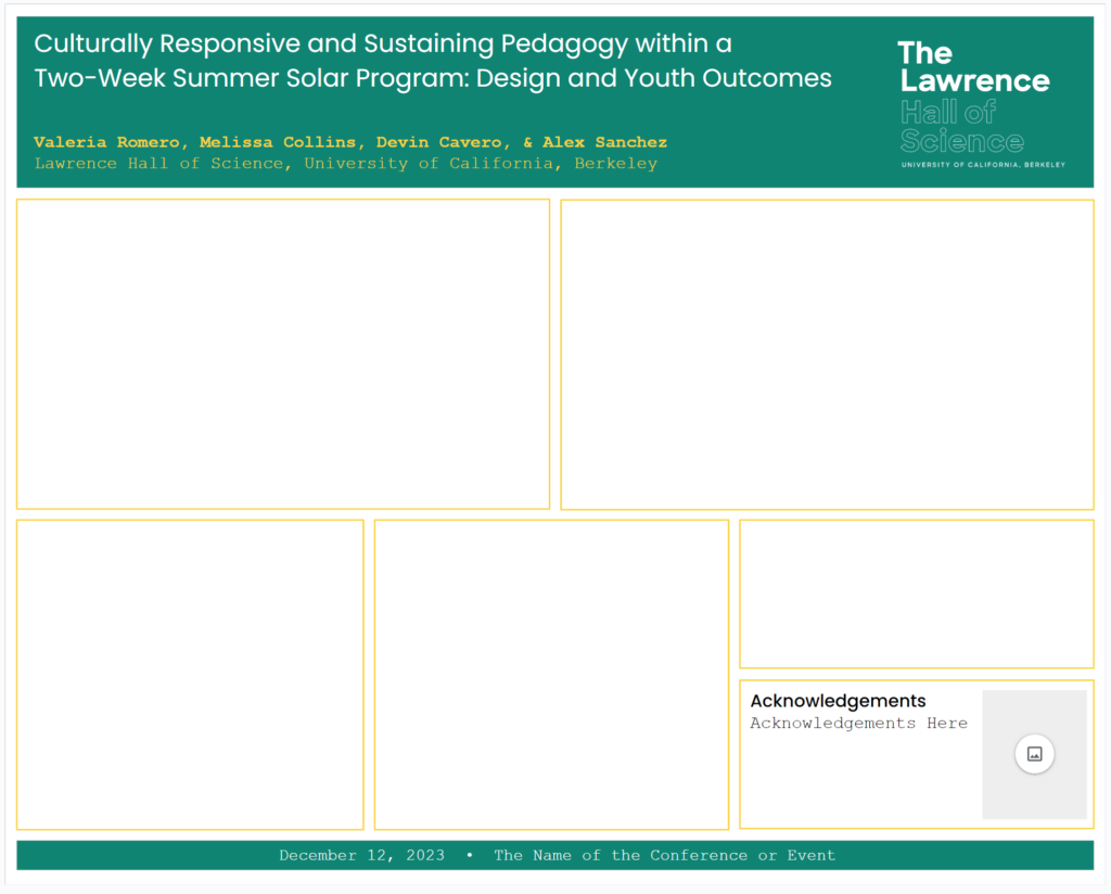 Poster templates are available in Google Slides in two standard sizes. They are designed for The Lawrence and up to four partners’ logos. There’s also a space for an acknowledgment logo. On the final slides, we have provided approved Lawrence science icons to supplement your poster.